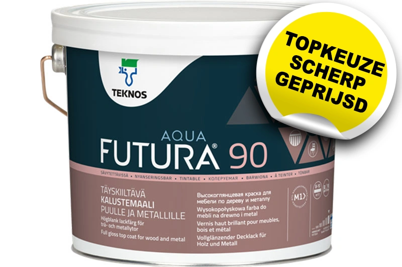 Futura Aqua 90 is een sneldrogende, watergedragen hoogglanzende aflak voor binnen en buiten. Dit product is zeer geschikt voor het aflakken van houten ramen, deuren, kozijnen, vensterbanken, trappen, meubelen en tuinmeubelen. Maar is ook geschikt als aflak op voorbehandelde metalen ondergronden, zoals radiatoren en leidingen, en voorbehandelde gegalvaniseerde ondergronden, zoals luchtkanalen. Deze grondverf kunt u aanbrengen met een lakkwast en vilt/mohair roller en is in vele dekkende kleuren verkrijgbaar. Dit product voldoet aan de eisen van speelgoedveiligheidsnorm EN 71-3:2013 + A3:2018 voor grenswaarden voor migratie van chemische elementen. Futura Aqua 90 heeft een M1 classificatie en een Finnish Key vlag certificaat.
