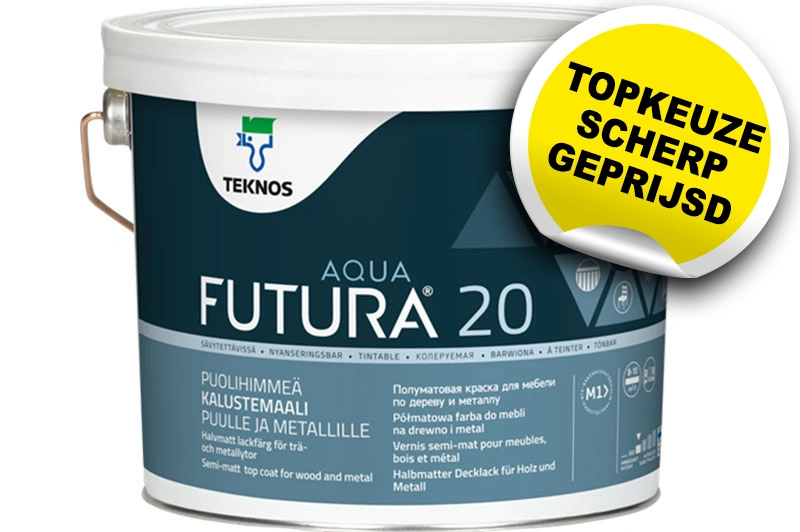 - Teknos Futura Acqua 40 (zijdeglans) en Teknos Futura Acqua 90 (hoogglans)