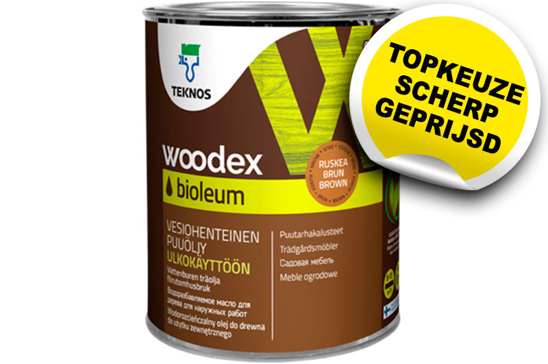 Teknos Woodex Bioleum is een watergedragen olie die speciaal ontwikkeld is voor het verfraaien en waterafstotend maken van (buiten) hout. De olie dringt in het hout en geeft het hout een zeer natuurlijke, matte uitstraling met behoud van de hout structuur. Na aanbrengen van de olie vormt er geen film of voelbare laag op het hout. De gekleurde varianten geven een goede bescherming tegen UV-licht en daarmee tegen vergrijzing. Hoe donkerder de kleur van de olie hoe langer de bescherming van het hout en het onderhoudsinterval. De opname van water wordt tegengegaan door de waterafstotende werking van de olie. Hierdoor vermindert het krimpen en zwellen van het hout en is het hout beschermd tegen scheuren. De olie kan niet afbladderen en zorgt ook voor bescherming tegen indringing van vuil.